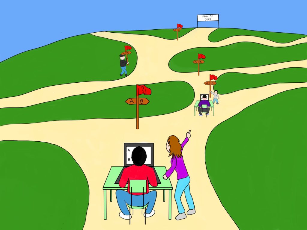 Els alumnes van construint l’aprenentatge, normalment treballant en grup i amb l’ajut de l’ordinador, en un marc dissenyat pel docent: el punt de sortida i el d’arribada. Però el camí cadascú el construeix a la seva manera, per on li convé, per on li fa més ganes o per on més li interessa. Si cada estudiant ha de construir el seu camí d’aprenentatge, quan el recorren?